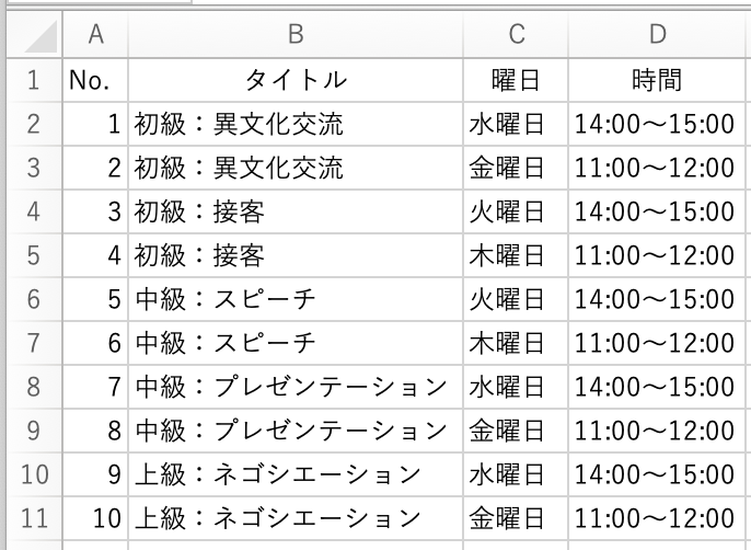 ここでは、コースナンバーに対応する内容(タイトル・曜日・時間)をまとめたマスタを「Sheet2」に用意しました。