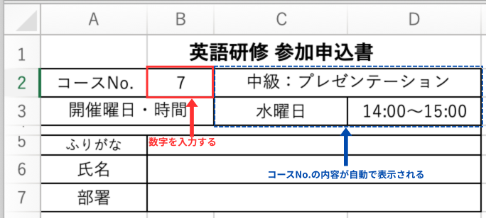 これにより、赤枠の【B2】のコースNo.に数字を入力すると、青枠の「コース名」「開催曜日」「開催時間」が自動で表示されます。