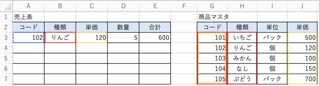 【A3】にコードを入力すると【B3】に種類、【C3】に単価が表示されるようにします。